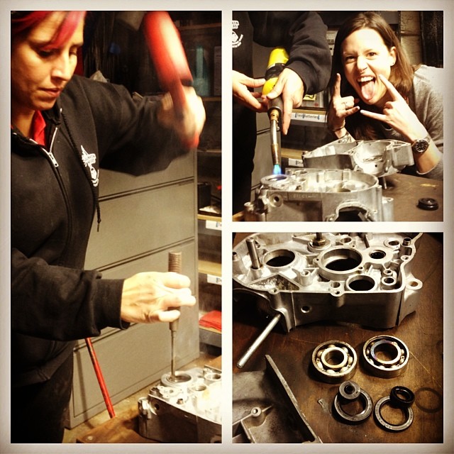 Monday nights this winter are all about my little dirtbike rebuild over at the MotorGrrl garage. Miss-Fires member and MotorGrrl owner Valerie is a fantastic host with beers on ice and music cranked. And leave it to the Miss-Fires ladies to always arrive with baked goods…mmmmm.